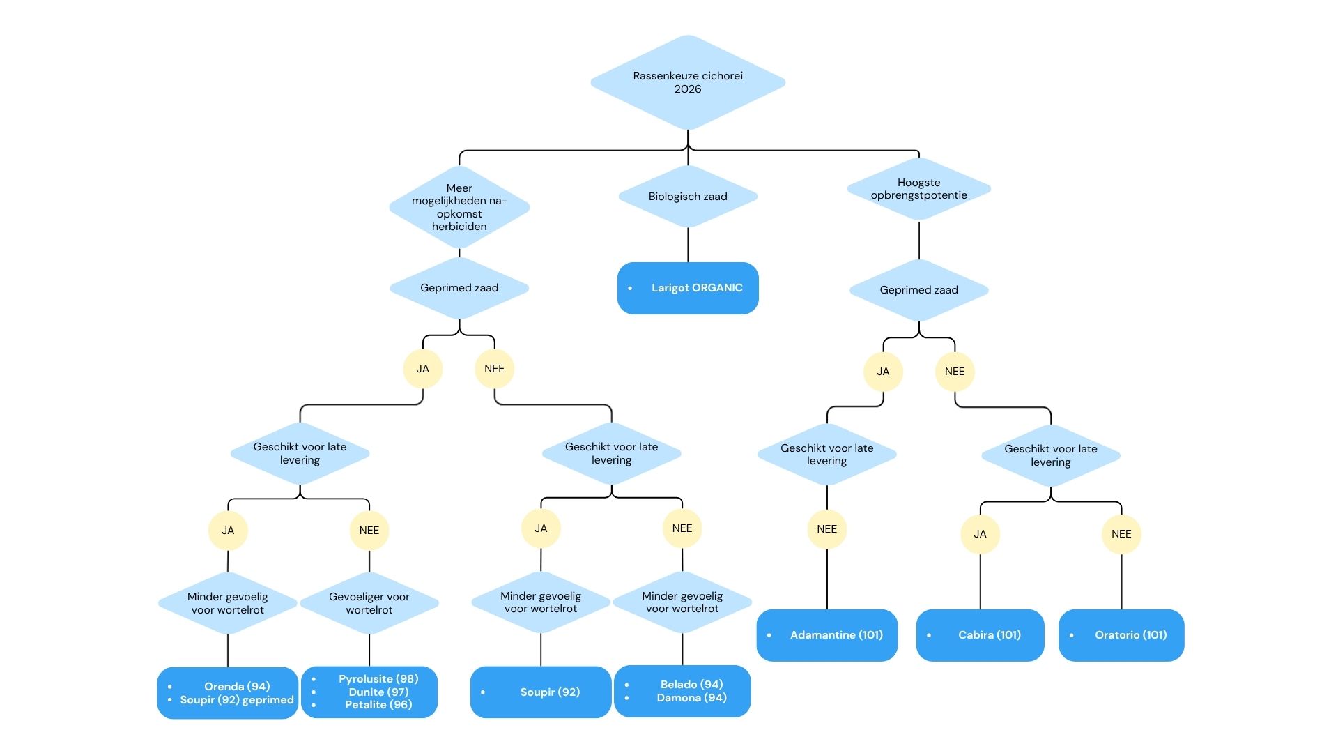 Figuur 1: Beslisboom bij de rassenkeuze voor 2026. Achter elk ras is tussen haakjes de potentiële financiële opbrengst weergegeven.