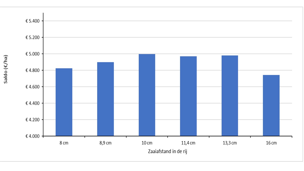 Als de kosten van het zaaizaad worden meegenomen, verschuift het optimum naar een ruimere zaaiafstand. Een zaaiafstand van 10 centimeter is optimaal, maar bij zaaiafstanden tot 13,3 centimeter daalt het saldo nauwelijks: circa €20 per hectare. Bij zaaiafstanden nauwer dan 10 centimeter daalt het saldo sneller. Dit komt doordat zaaiafstanden van 8,9 of 8,0 centimeter niet zorgen voor extra inulineopbrengst, terwijl de zaaizaadkosten met 12,5% en 25% toenemen. Als op 16 centimeter gezaaid wordt, daalt het saldo met gemiddeld €250 ten opzichte van 10 centimeter (zie grafiek 2).